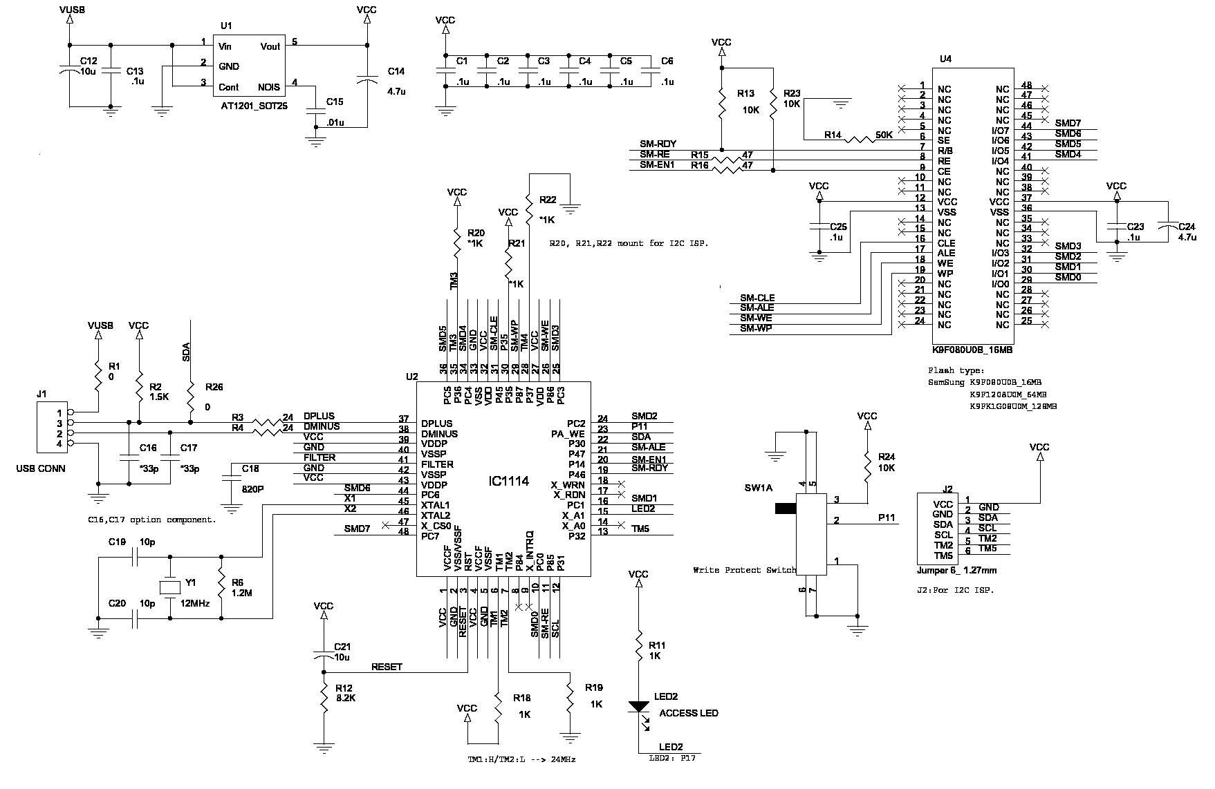 此U盤電路圖由主IC1114組成,電路簡單,成本低廉。優(yōu)盤電路圖支持Flash type:SamSung K9F080U0B_16MB,K9F1208U0M_64MB,K9FK1G08U0M_128MB等。