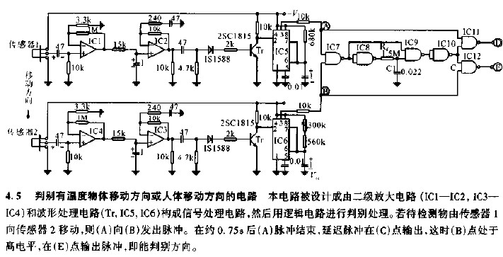 本例電路利用兩個特性一致的光敏電阻和繼電器來判斷物體的移動方向。