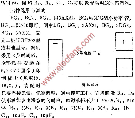 V1,V2構(gòu)成互補(bǔ)自激振蕩器,利用R,C的充放電模擬鳥(niǎo)兒的鳴叫聲。