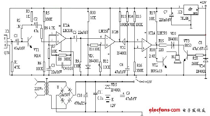 該裝置由紅外線傳感器、信號(hào)放大電路、 電壓 比較器、延時(shí)電路和音響報(bào)警電路等組成。 紅外線探測(cè)傳感器 IC1 探測(cè)到前方人體輻射出的紅外線信號(hào)時(shí),由 IC1 的 ② 腳輸出微弱的電 信號(hào),經(jīng)三極管 VT1 等組成第一級(jí)放大電路放大,再通過 C2 輸入到運(yùn)算放大器 IC2 中進(jìn)行 高增益、低噪聲放大,此時(shí)由 IC2 ① 腳輸出的信號(hào)已足夠強(qiáng)。 IC3 作電壓比較器,它的第 ⑤ 腳由 R10 、 VD1 提供基準(zhǔn)電壓,當(dāng) IC2 ① 腳輸出的信號(hào)電壓到達(dá) IC3 的 ⑥ 腳時(shí),兩個(gè)輸入端 的電壓進(jìn)行比較,此時(shí) IC3 的 ⑦ 腳由原來的高電平變?yōu)榈碗娖健?IC4 為報(bào)警延時(shí)電路, R14 和C6 組成延時(shí)電路,其時(shí)間約為 1 分鐘。當(dāng) IC3 的 ⑦ 腳變?yōu)榈碗娖綍r(shí), C6 通過 VD2 放電,此時(shí) IC4 的 ② 腳變?yōu)榈碗娖?,它與 IC4 的 ③ 腳基準(zhǔn)電壓進(jìn)行比較,當(dāng)它低于其基準(zhǔn)電壓時(shí),IC4 的 ① 腳變?yōu)楦唠娖剑?VT2 導(dǎo)通,訊響器 BL 通電發(fā)出報(bào)警聲。人體的紅外線信號(hào)消失后 ,IC3 的 ⑦ 腳又恢復(fù)高電平輸出,此時(shí) VD2 截止。由于 C6 兩端的電壓不能突變,故通過 R1向 C6 緩慢充電,當(dāng) C6 兩端的電壓高于其基準(zhǔn)電壓時(shí), IC4 的 ① 腳才變?yōu)榈碗娖?,時(shí)間約為 1 分鐘,即持續(xù) 1 分鐘報(bào)警。電路原理如圖1所示。