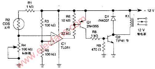 控制輸出的光控開(kāi)關(guān)電路有許多形式,如自鎖亮激發(fā)、暗激發(fā)及精密亮激發(fā)、暗激發(fā)等等,下面給出幾種典型電路。圖中是一種簡(jiǎn)單的暗激發(fā)繼電器開(kāi)關(guān)電路。其工作原理是:當(dāng)照度下降到設(shè)置值時(shí)由于光敏電阻阻值上升激發(fā)VT1導(dǎo)通,VT2的激勵(lì)電流使繼電器工作,常開(kāi)觸點(diǎn)閉合,常閉觸點(diǎn)斷開(kāi),實(shí)現(xiàn)對(duì)外電路的控制。