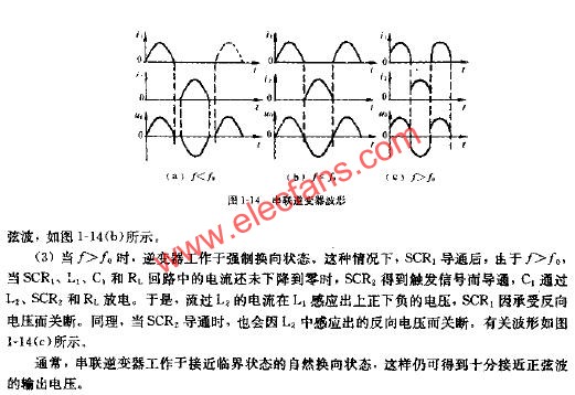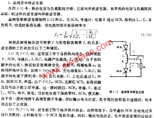 這種逆變器的基礎(chǔ)電路,如圖1-12所示。當(dāng)觸發(fā)信號交替地加到晶閘管SCR1和SCR2時,假定首先SCR1導(dǎo)通SCR2管斷。