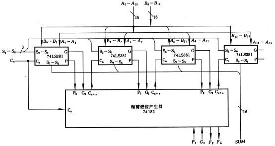 功能由功能選擇端(S0~S3)決定。利用進(jìn)位產(chǎn)生輸出端(FG)和進(jìn)位傳輸端(FP)與超前進(jìn)位產(chǎn)生器54/74182或54/74S182相連,可完成高速運(yùn)算。
