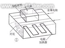 導(dǎo)電性傳感器的基本特點是,其置于揮發(fā)性化合物(VOC)時的響應(yīng)形式是電阻值發(fā)生變化。導(dǎo)電性傳感器又分為金屬氧化物傳感器和聚合物傳感器兩大類。金屬氧化物傳感器在電子鼻系統(tǒng)中應(yīng)用更廣泛,其結(jié)構(gòu)如圖1所示。此類傳感器中與VOC相接觸的活性材料是錫、鋅、鈦、鎢或銥的氧化物,襯底材料一般是硅、玻璃、塑料,發(fā)生接觸反應(yīng)需滿足200~400℃的溫度條件,因此在底部設(shè)置了加熱器。氧化物材料中用鉑、鈀等貴重金屬攙雜形成兩條金屬接觸電極。與VOC的相互作用改變了活性材料的導(dǎo)電性,使兩電極之間的電阻發(fā)生變化,這種電阻變化可用單臂電橋或其它電路來測量。事實上,一個傳感器的活性材料總是設(shè)計得對某些特定氣味響應(yīng)最靈敏。