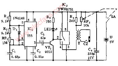 555袖珍電子定時催眠按摩器,由時基IC NE555組成。