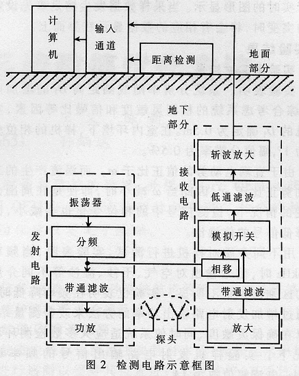 整個(gè)系統(tǒng)分為地上和地下兩部分,其基本組成結(jié)構(gòu)如圖2所示。兩大部分之間通過電纜相連接。地下部分中包括裝有線圈的探頭以及分別屏蔽在兩個(gè)金屬盒中的發(fā)射電路和接收電路。地下部分的所有裝置全部固定安裝在一節(jié)經(jīng)過防水處理的直徑為8cm左右的聚氯乙稀管內(nèi)。為了防止對(duì)探頭檢測(cè)過程的干擾,設(shè)計(jì)時(shí)應(yīng)該充分考慮地下部分的電路及導(dǎo)線的固定和屏蔽問題。