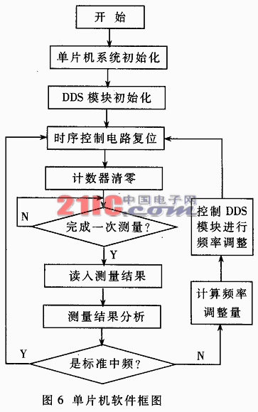 通電以后單片機(jī)首先進(jìn)行初始化,然后設(shè)置DDS模塊的工作模式等參數(shù),再進(jìn)行時(shí)序控制電路的復(fù)位并對(duì)所有計(jì)數(shù)器進(jìn)行清零操作。隨后單片機(jī)不斷查詢測(cè)量完成信號(hào)。當(dāng)時(shí)序控制電路在雷達(dá)觸發(fā)脈沖的作用下完成一次測(cè)量時(shí)?熏就通過(guò)該信號(hào)通知單片機(jī),單片機(jī)一旦查詢到測(cè)量完成便立即讀入測(cè)量結(jié)果。然后進(jìn)行分析,是標(biāo)準(zhǔn)中頻頻率時(shí)不進(jìn)行本振頻率的調(diào)整,直接準(zhǔn)備下一脈沖周期的測(cè)量,若不是則計(jì)算所需的頻率調(diào)整量,控制DDS頻率合成模塊進(jìn)行頻率調(diào)整,然后再準(zhǔn)備下一脈沖周期的測(cè)量。