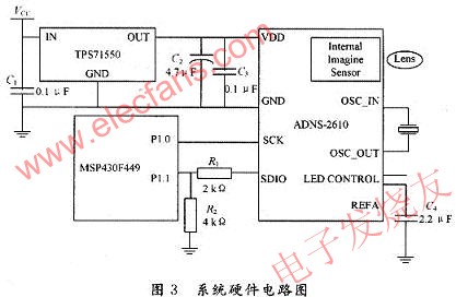整個系統(tǒng)的硬件電路如圖3所示。其中SDIO是串口數(shù)據(jù)輸入/輸出端口;SCK是串口的時鐘端口。時鐘信號由主控制器MSP430F449發(fā)出。當向SDIO端口寫入讀/寫地址以后,數(shù)據(jù)就通過這個端口寫入或讀出。ADNS-2610的輸出電壓為5 V,而MSP430的I/O端口輸入高電平最高為3.6V,因此要對ADNS-2610的SDIO輸出電平降壓,使之符合MSP430對輸入電平的要求。如圖3所示,通過外接分壓電阻的方式降低ADNS-2610的SDIO端口的電壓。ADNS-2610的SCK端口只接收時鐘信號。ADNS-2610接收的高電平信號電壓范圍是2~5 V,而MSP430輸出的高電平信號為3V,符合ADNS對高電平的要求,因此不用考慮電平的調(diào)整。