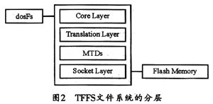 圖2所示為TFFS文件系統(tǒng)的分層圖。圖中的Core Layer內核層可將其他層連接起來協(xié)同工作;翻譯層主要實現(xiàn)DOS和TFFS之間的交互、管理文件系統(tǒng)和Flash各個物理塊的關系,同時支持TFFS的各種功能,如磨損均衡、錯誤恢復等;MTD層執(zhí)行底層的程序驅動(map、read、write、erase等);socket層的名稱來源于可以插拔的socket存儲卡,主要提供與具體的硬件板相關的驅動。