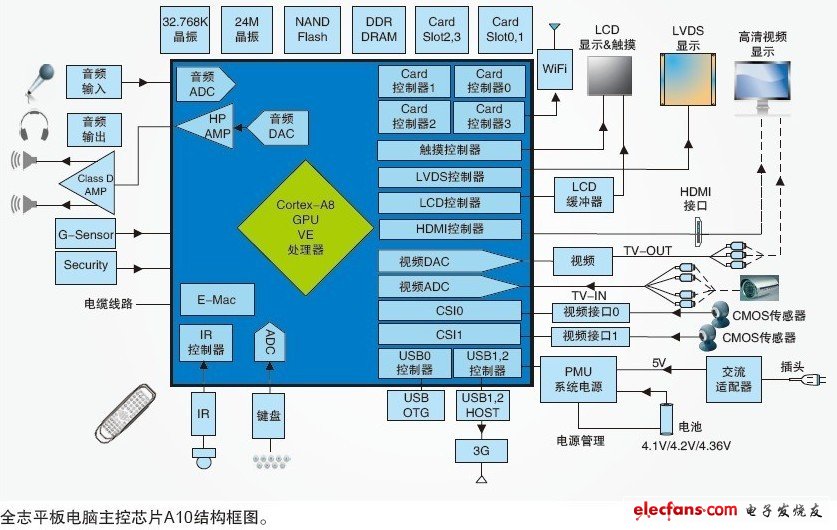 從A10的結(jié)構(gòu)框圖中可以看到,該SoC集成了HDMI、LVDS、LCD、Touch Driver、Ethernet MAC、Audio Codec、SATA、GPS等多項(xiàng)功能以及DDR/DDR2/DDR3、NAND Flash、WiFi、Video port、PMU等接口,依賴其優(yōu)秀的數(shù)模整合能力,全志把SoC集成度做得非常高,把許多需要在板級處理的設(shè)計(jì)直接通過芯片完成,解決硬件系統(tǒng)設(shè)計(jì)問題并簡化了PCB布板要求,降低了方案集成商成本和開發(fā)難度。