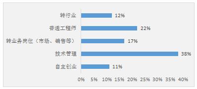 從數(shù)據(jù)看,35歲從事技術(shù)管理類崗位的比例最大,從事普通工程師的比例其次,仍在技術(shù)領(lǐng)域的兩項合計占60%。