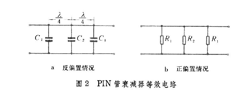 PIN管具有不同的正反向特性,當(dāng)它被反向偏置時(shí)可等效為小電容而近似開路,而在正向偏置時(shí)則可等效為可變電阻,若偏壓增大,其阻值則減小。PIN管衰減器(圖1)就是利用這一特性工作的,從它的等效電路(圖2)可見,當(dāng)PIN管反偏置時(shí),衰減器即相當(dāng)于濾波器,可設(shè)計(jì)成幾乎沒有衰減,而PIN管正偏置時(shí),衰減器為一電阻衰減器,改變偏壓即可改變衰減。若正偏置衰減甚大而反向偏置衰減甚小,衰減器即成為開關(guān)器。若以調(diào)制信號(hào)作為偏置電壓,則通過衰減器的微波信號(hào)會(huì)受到幅度調(diào)制,遂成為調(diào)幅器。