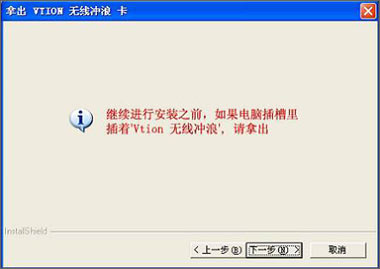 安裝驅(qū)動(dòng)程序之前,請(qǐng)不要把VTION 無線沖浪卡插入插槽。若您將VTION 無線沖浪卡插入插槽后安裝驅(qū)動(dòng)程序,會(huì)有下列窗口顯示,此時(shí)您必須要點(diǎn)擊“取消”,從插槽里拿出卡之后開始進(jìn)行安裝。