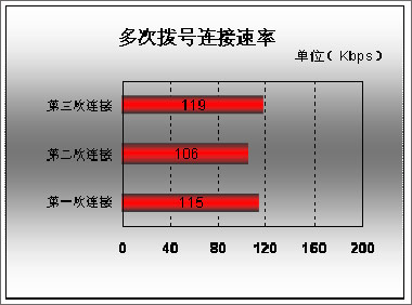 下面是連入Internet的多次撥號(hào)連接速率,平均速率在113Kbps左右。當(dāng)然,由于無線信號(hào)不能象有線信號(hào)那么穩(wěn)定,而且實(shí)際的上網(wǎng)速度也因地域的不同以及筆記本電腦的配置不同而有所區(qū)別,即使是通過“CDMA手機(jī)+筆記本”與通過“CDMA1X無線網(wǎng)卡+筆記本”上網(wǎng)也有很大的區(qū)別。我們這里的測試數(shù)據(jù)來自廣東省廣州市天河區(qū),測試用的筆記本電腦是騰龍X71的C-M那一款,下面包括后面的數(shù)據(jù)僅供參考。