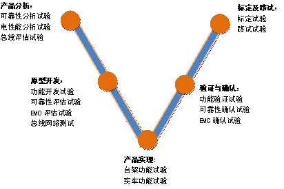 ????? V流程作為一種科學(xué)的開發(fā)流程,已經(jīng)在汽車電子產(chǎn)品開發(fā)領(lǐng)域得到廣泛應(yīng)用。作為產(chǎn)品開發(fā)過程的驗(yàn)證手段,試驗(yàn)測試貫穿于V流程的各個階段,如圖所示。