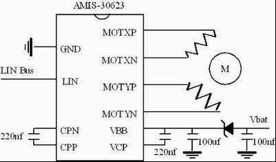 此處選擇了美國AMI半導體公司的AMIS-30623步進電機控制芯片。該芯片屬高集成度芯片,內(nèi)建了電源模塊、控制器、LIN總線收發(fā)器和步進電機驅(qū)動。其主要特性有:最高峰值電流輸出達800mA;提供最高達16細分數(shù)的步進電機驅(qū)動;內(nèi)建加減速算法;完全兼容LIN1.3規(guī)范。