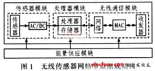 傳感器節(jié)點(diǎn)一般由傳感、數(shù)據(jù)處理、無線通信和供電等4個(gè)模塊組成,如圖l所示。