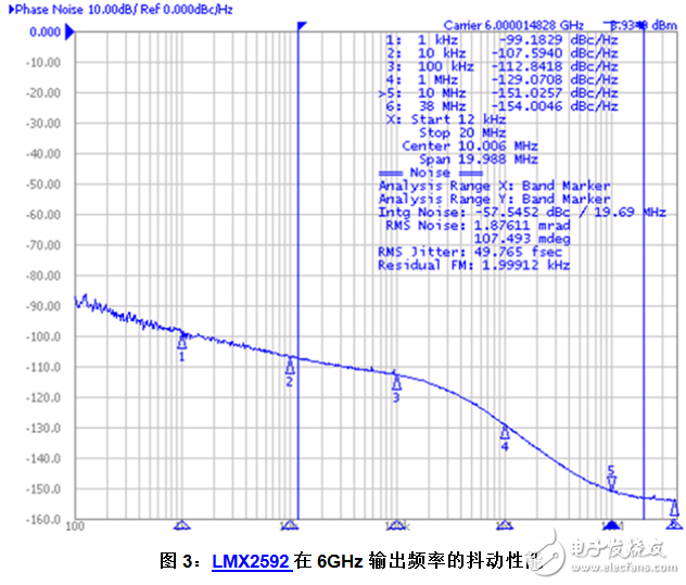 高性能計(jì)時(shí)的另一個(gè)選擇(尤其是對(duì)于直接射頻采樣結(jié)構(gòu))是使用LMX2592射頻合成器,并結(jié)合LMK04828。LMX2592的高輸出擺幅和低相位噪聲使它能實(shí)現(xiàn)具有12kHz-20MHz積分帶寬的,并小于50fs均方根(RMS)的抖動(dòng),實(shí)現(xiàn)高射頻頻率下信噪比的多分貝改善,如圖3所示。LMK04828作為L(zhǎng)MX2592的參考時(shí)鐘,同時(shí)也為JESD204B子類1確定性延遲生成SYSREF信號(hào)。