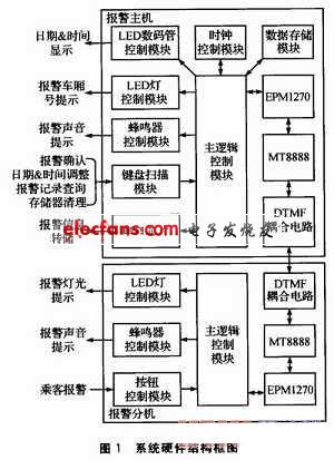 報(bào)警主機(jī)的硬件設(shè)計(jì)按照模塊化原則,可分為如下幾個(gè)功能模塊:主邏輯控制模塊、基于MT8888的DTMF通信模塊、LED數(shù)碼管控制模塊、LED燈控制模塊、蜂鳴器控制模塊、鍵盤掃描模塊、時(shí)鐘控制模塊、存儲(chǔ)控制模塊、數(shù)據(jù)存儲(chǔ)模塊等。系統(tǒng)硬件結(jié)構(gòu)框圖如圖1所示。