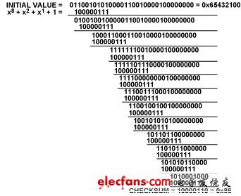 CRC-8?算法采用多項(xiàng)式 C(x) = x8 + x2 + x1 + 1. For x = 2時(shí),此式 等于二進(jìn)制值100000111。要生成校驗(yàn)和,需將24 位數(shù)據(jù)左移 8 位,產(chǎn)生一個(gè)后8 位為邏輯0 的32 位數(shù)。對(duì)齊CRC 多項(xiàng)式, 使其MSB 與該32 位數(shù)據(jù)最左側(cè)的邏輯1 對(duì)齊。對(duì)該數(shù)據(jù)施加 一個(gè)異或(XOR)函數(shù),以產(chǎn)生一個(gè)新(更短)的數(shù)字。(數(shù) 字匹配得到邏輯0,不匹配得到邏輯1。)再次對(duì)齊CRC 多項(xiàng) 式,使其MSB 與第一個(gè)結(jié)果最左側(cè)的邏輯1 對(duì)齊,重復(fù)上述 步驟。最后,原始數(shù)據(jù)將減少至小于CRC 多項(xiàng)式的值。此值 即是8 位校驗(yàn)和。圖2 演示了推演校驗(yàn)和的方法。