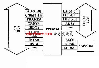 ??? PCI9054提供了3種物理總線接口:CPCI總線接口、LOCAL總線接口和串行EPROM接口。其中CPCI總線接口協(xié)議在嵌入式操作系統(tǒng)中的驅(qū)動(dòng)包已經(jīng)帶有,而串行EEPROM的初始化是由PLX公司的PLXMON軟件在嵌入式操作系統(tǒng)中進(jìn)行在線燒寫(xiě)的,所以本系統(tǒng)設(shè)計(jì)的重點(diǎn)就是關(guān)于LOCAL總線接口的控制和傳輸,其接口電路示意圖如圖2所示。