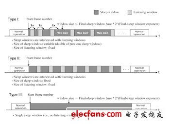 類型I由多個(gè)聆聽時(shí)段及睡眠時(shí)段交錯(cuò)組成,其中前者是固定長(zhǎng)度,后者則是可變動(dòng)長(zhǎng)度且長(zhǎng)度會(huì)逐次兩倍遞增。省電類別啟用后,基站必須定時(shí)廣播流量信息(Traffic Indication),讓客戶端確認(rèn)基站的傳輸服務(wù)維持正常。若基站欲下傳封包時(shí),會(huì)先確認(rèn)兩端鏈接正常后才開始傳送,故較能避免封包傳輸出錯(cuò)。另外,客戶端在使用聯(lián)機(jī)收送封包的同時(shí),會(huì)直接停用對(duì)應(yīng)的省電類別;而基站在收到某聯(lián)機(jī)的頻寬需求信息后,也會(huì)主動(dòng)停用省電類別,因此可減少客戶端發(fā)送的控制信息數(shù)目。