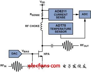 閾值電壓Vth和有效電子遷移率μ隨溫度的上升而降低。因此,溫度的變化會(huì)引起輸出功率的變化。使用一個(gè)或幾個(gè)ADT75 12-bit溫度傳感器來測(cè)量環(huán)境溫度和功放芯片溫度,可以對(duì)電路板上的溫度變化進(jìn)行監(jiān)測(cè)。ADT75是一個(gè)完整的溫度監(jiān)測(cè)系統(tǒng),采用8引腳MSOP封裝,在0°C~70°C的溫度范圍內(nèi)具有±1°C的精度。