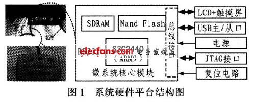 1)微系統(tǒng)核心模塊 由基于ARM920T的32位嵌入式微處理器S3C2440、SDRAM和Nand FLASH構(gòu)成和總線接口構(gòu)成。2片32 MB的HY57V561620構(gòu)成64 MB的SDRAM存儲(chǔ)器,用于運(yùn)行系統(tǒng)主程序。存儲(chǔ)容量為64 M×8 bit的Nand FLASHK9F1208UOM,因其具有掉點(diǎn)保護(hù)功能,用于存儲(chǔ)操作系統(tǒng)內(nèi)核、Bootloader的啟動(dòng)代碼和用戶程序。