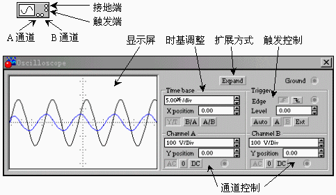 示波器為雙蹤模擬式,其圖標(biāo)和面板如下圖所示。