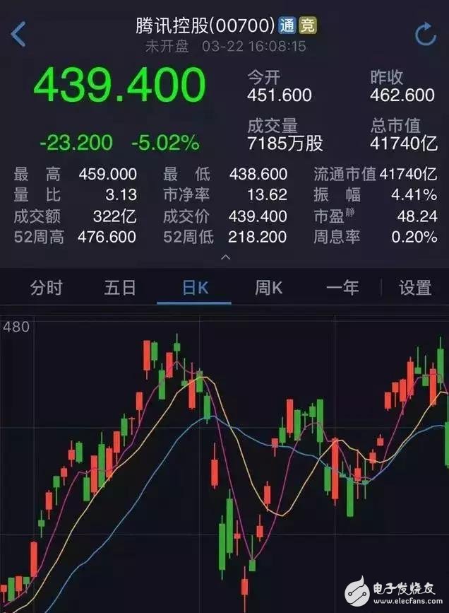 并且,上周三(3月21日),騰訊控股公布2017年年度業(yè)績之后,騰訊已從近一個(gè)月的高點(diǎn)475.6港元每股接連下跌,盡管近期有所回升,但受全球科技股下跌影響,3月28日收盤價(jià)為412.2港元/股,下跌4.63%,僅僅一周時(shí)間股價(jià)就已經(jīng)下跌了13.3%。