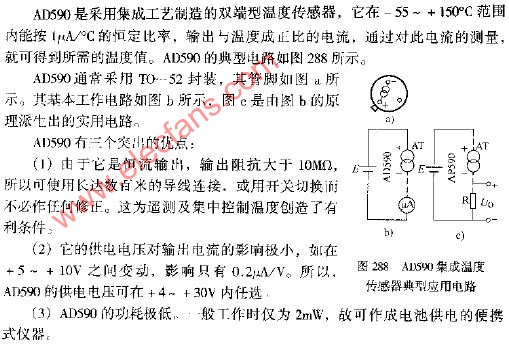 AD590是AD公司利用PN結(jié)構(gòu)正向電流與溫度的關(guān)系制成的電流輸出型兩端溫度傳感器,文中介紹了AD590的功能和特性,分析了
