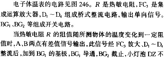 亮,這時旋動電位器W2,使A、B兩點間無差值信號輸出,則BG1截止、BG2導(dǎo)通,小燈泡就亮。如果電位器W旋轉(zhuǎn)角度記以溫度刻度,那么就可以在燈亮?xí)r,讀出被測物體的溫度了。