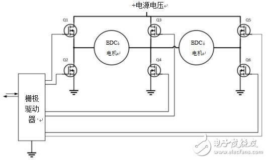 由于座椅包含多種電機,有時可能有必要通過共享的開關MOSFET來簡化驅動電子器件。圖2展示能驅動兩個電機的三個共享半橋。一般來說,N+1個半橋電路能驅動N個獨立的BDS電機。