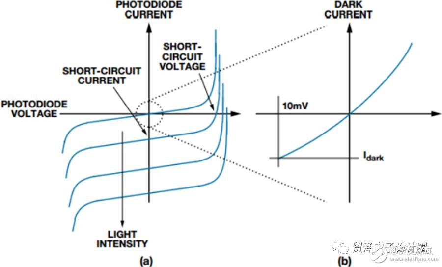 該電路的光電二極管在光伏模式下工作,其中運(yùn)算放大器保持光電二極管上的電壓為0 V。這是精密應(yīng)用中最常見的配置。光電二極管的電壓與電流關(guān)系曲線十分類似于常規(guī)二極管,但前者的整條曲線會(huì)隨著光照水平的變化而向上或向下平移。圖2a顯示典型的光電二極管傳遞函數(shù)。圖2b是傳遞函數(shù)放大后的圖形,表明哪怕在沒有光的情況下,光電二極管也會(huì)輸出少量電流。這種暗電流會(huì)隨著光電二極管上的反向電壓增加而上升。大部分制造商在反向電壓為10 mV的前提下給出光電二極管的暗電流。