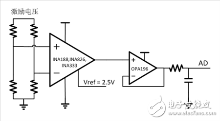 上圖所示的是一個典型的電橋測量方案,包含前級差分儀表放大器,電平移位限幅緩沖驅動ADC等結構,提供高精度的小信號采樣。典型的儀表放大器可以參考INA188, INA826, INA333,可以覆蓋從高電壓到低功耗的全部場合,并且CMRR在放大倍數為10的時候的最小值大于100dB。OPA196為TI全新一代的E-trim運算放大器,直流失調電壓更是在100uV以下,OPA191甚至達到5uV 。這樣高的CMRR和低的失調電壓,提高系統(tǒng)精度的同時可以降低系統(tǒng)的設計難度和成本,提升產品的競爭力。