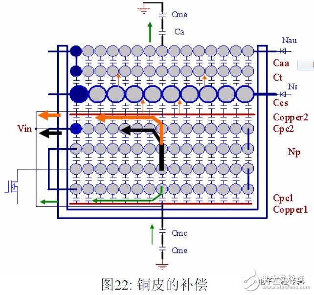 如果按圖20結(jié)構(gòu)安排冷點(diǎn)(藍(lán)色點(diǎn))和繞組,在沒有Y電容時(shí),基于電壓改變的方向可以得到初級繞組與次級繞組及輔助繞組和次級繞組層間電容的電流的流動方向,初級繞組和輔助繞組的電流都流入次級繞組中。