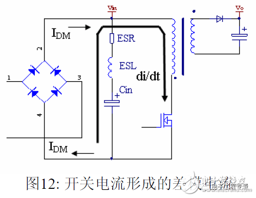 ③功率開關(guān)工作于開關(guān)狀態(tài),開關(guān)電流(開關(guān)頻率)的高次諧波也會因?yàn)檩斎霝V波的直流電解電容的ESL和ESR形成差模電流。