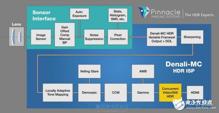 據(jù)了解,Pinnacle設(shè)計(jì)的Denali-MC IP目前已經(jīng)可以在包括Xilinx的Zynq 7045 FPGA芯片在內(nèi)的多款可編程芯片產(chǎn)品中實(shí)現(xiàn),比如可以用在具有DSP和SoC+ DSP架構(gòu)的產(chǎn)品中(包括TI和Qualcomm的相關(guān)產(chǎn)品)。還了解到Denali-MC monitor的ISP的核心是一個(gè)基于超級算法的內(nèi)核,這個(gè)算法core不僅可以為HDR動(dòng)作產(chǎn)品在圖像補(bǔ)償時(shí)提供最大可能HDR,還可以提供一個(gè)end-to-end的全相機(jī)ISP,而擁有這兩個(gè)優(yōu)勢對于一個(gè)相機(jī)系統(tǒng)是十分有意義的,因?yàn)樗鼈兛梢栽谙鄼C(jī)試圖捕捉一天中任何時(shí)間任何場景下的可用視頻和最大可能識別視頻點(diǎn)發(fā)揮重要作用。下面對Denali-MC的詳細(xì)情況作一點(diǎn)簡單說明。