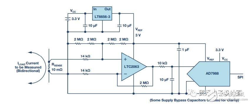 圖2. 電流檢測(cè)電路隨同檢測(cè)電阻電壓浮空。斬波運(yùn)算放大器LTC2063放大檢測(cè)電壓,把它偏置到AD7988 ADC的中間軌。LT6656-3提供精密3 V基準(zhǔn)電壓源。