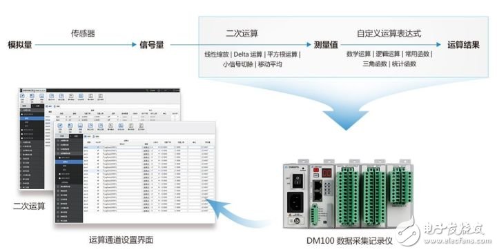 DM100數(shù)據(jù)采集模塊在采集信號(hào)量后,用戶可通過線性縮放、Delta運(yùn)算、平方根運(yùn)算等二次運(yùn)算得到所需的測量值,同時(shí)還能對(duì)測量值進(jìn)行自定義表達(dá)式運(yùn)算,將測量值或運(yùn)算值作為變量在表達(dá)式中執(zhí)行,保存運(yùn)算結(jié)果。并可將測量數(shù)據(jù)及時(shí)保存在內(nèi)存中,支持8G以上存儲(chǔ)容量,連續(xù)記錄測量數(shù)據(jù)可達(dá)60天以上,并可根據(jù)指定通道生成報(bào)表,導(dǎo)出文本或二進(jìn)制格式,方便數(shù)據(jù)的統(tǒng)計(jì)與分析。