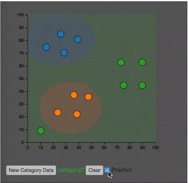 如上圖所示,K=3,鼠標移動到任何一個點,就找到距離該點最近的K個點,然后,這K個點投票,多數(shù)表決獲勝。就是這么簡單。