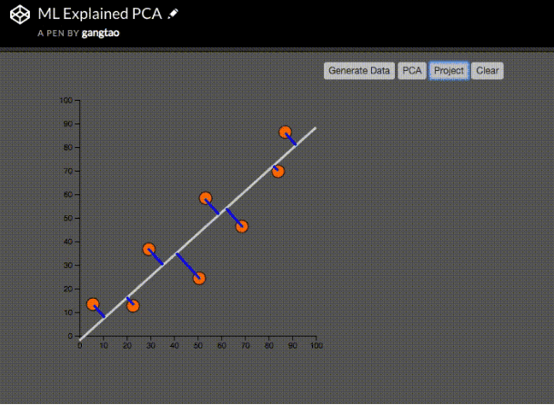 這里我們先用鼠標隨機生成8個數(shù)據(jù)點,然后繪制出表示主成分的白色直線。這根線就是二維數(shù)據(jù)降維后的主成分,藍色的直線是數(shù)據(jù)點在新的主成分維度上的投影線,也就是垂線。主成分分析的數(shù)學意義可以看成是找到這根白色直線,使得投影的藍色線段的長度的和為最小值。