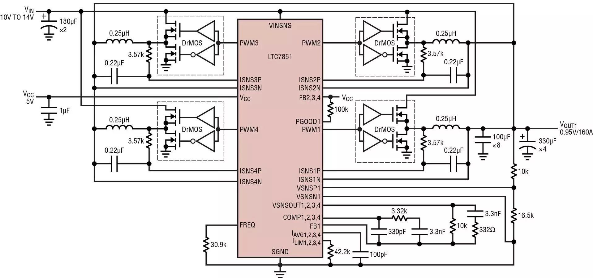 圖 1:簡(jiǎn)化的 LTC7851 原理圖,提供單個(gè) 0.95V/160A 輸出 |