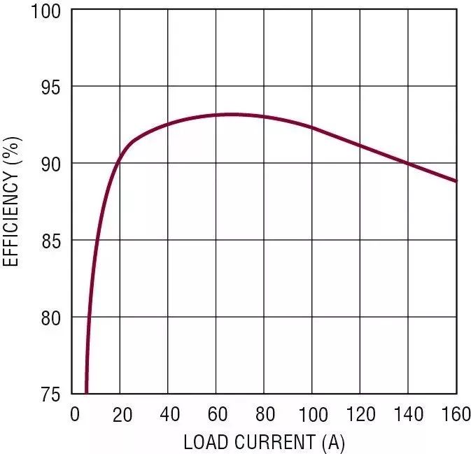 圖 2 中的 LTC7851 效率曲線可作為圖 1 原理電路的效率曲線示例,這時(shí) 12V 輸入電壓降壓至 0.95V,輸出電流高達(dá) 160A??梢詫?shí)現(xiàn)高達(dá) 94% 的效率。