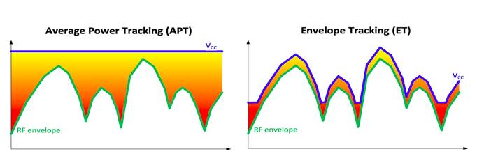 目前手機(jī)上常用的有兩種 PA 的省電技術(shù),一種是平均功率跟蹤技術(shù)(APT),另外一種是包絡(luò)跟蹤(ET),如上圖所示。