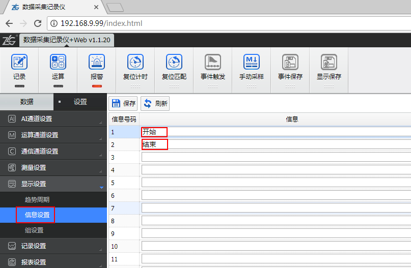 • 如圖8所示,在設(shè)置界面的顯示設(shè)置里選擇“信息設(shè)置”,例如分別設(shè)置信息號碼1/2為開始/結(jié)束;