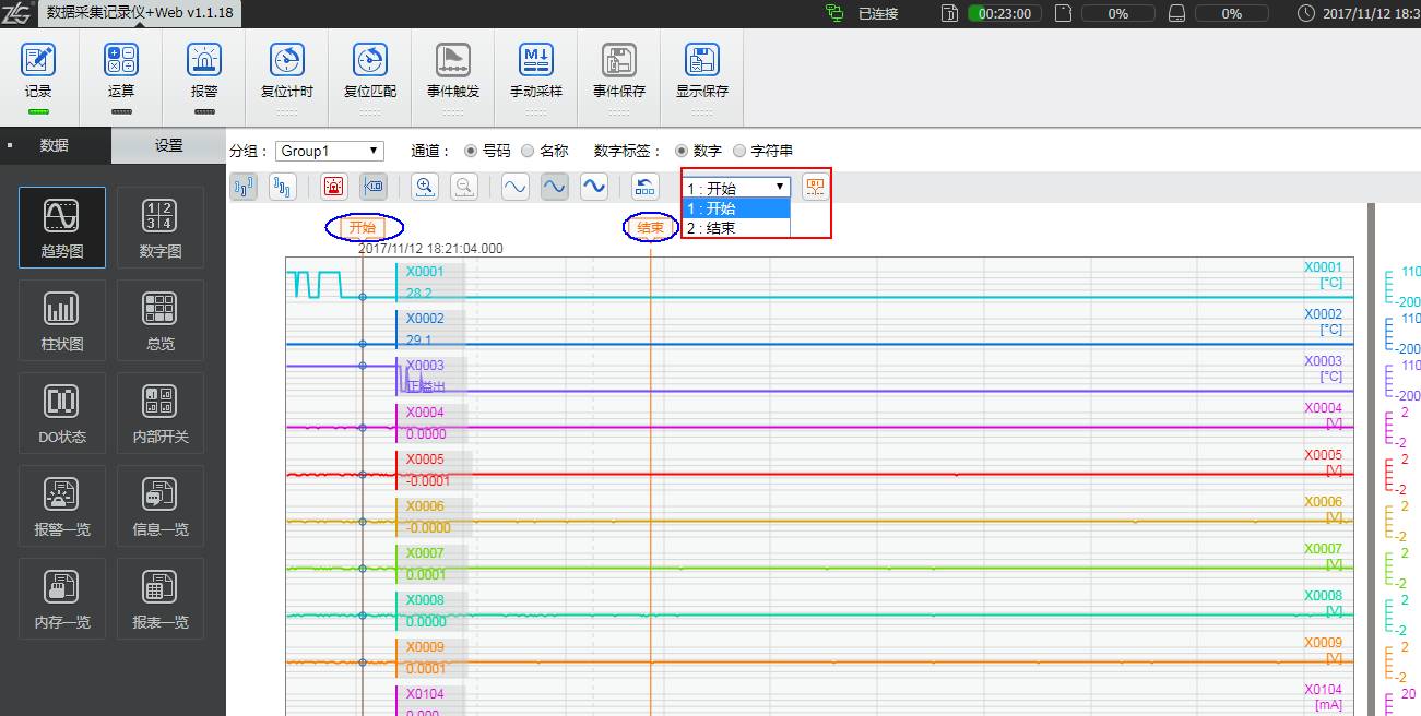 • 如圖9所示,在數(shù)據(jù)界面的趨勢圖中點擊所要標(biāo)記的地方,分別選擇所需要的信息進(jìn)行標(biāo)記。