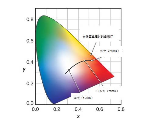 該圖描繪了各種光源的色度。黑線表示白光的黑體軌跡。從白熾燈中去除藍(lán)色輻射會讓它變成黃綠色。雖然燭光在技術(shù)上分類為白光,但燭光具有明顯的黃色色調(diào)。