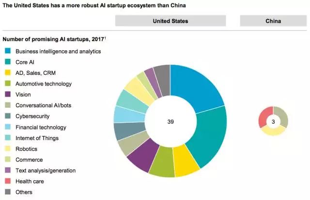 表3:美國的 AI 創(chuàng)業(yè)生態(tài)系統(tǒng)比中國更強大。上圖顯示中國和美國在50家最大(按總?cè)谫Y額排名)AI 創(chuàng)業(yè)公司中的占比,數(shù)據(jù)來自 CB Insight 發(fā)表的 AI 100 榜單。via: CB Insights; McKinsey analysis
