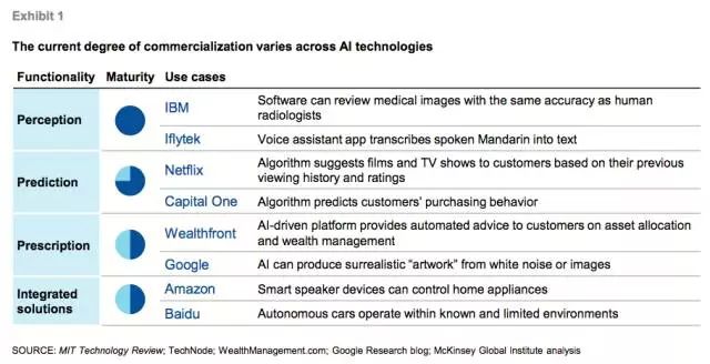 圖1:AI 技術(shù)當(dāng)下的商業(yè)化,麥肯錫認(rèn)為,IBM 和訊飛的商業(yè)應(yīng)用屬于感知技術(shù)。而百度和亞馬遜則是結(jié)合硬件的解決方案。